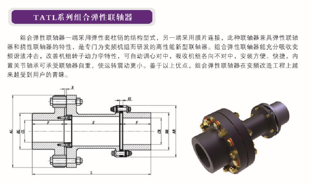 聯(lián)軸器型號 功率 / 轉速 (Kw/rpm) 公稱(chēng)扭矩 (KNm) *大許用轉速 (r/min) AL/AR (mm) BL/BR (mm) CL/CR max (mm) S/S1 (mm) E (mm) F (mm) L (mm) TATL6196 0.25 2.38 2850 250/196 165/133 110/95 3/14 160 100 360 TATL6210 0.30 2.94 27......