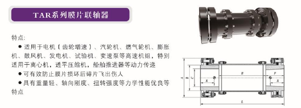 聯(lián)軸器型號 功率 / 轉速 (Kw/rpm) 公稱(chēng)扭矩 (KNm) 峰值扭矩 (KNm) *大許用轉速 (r/min) A (mm) B (mm) C(mm)max E(mm) F (mm) L(mm) TAR6115 0.072 0.68 2.4 32000 115 62 40 160 45 250 TAR6135 0.16 1.52 3.3 28000 135 82 55 170......