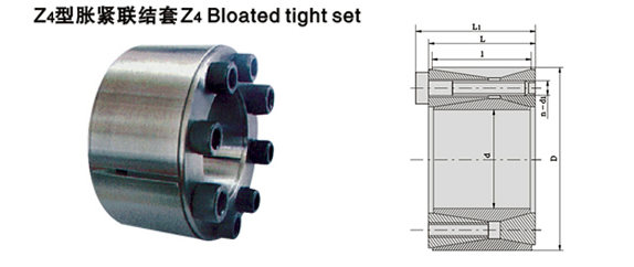 Z4型脹套特性: Z4型脹套由錐度不同的開(kāi)口雙錐內環(huán)與開(kāi)口雙錐外環(huán)及兩個(gè)雙錐壓緊環(huán)組成,用內六角螺栓鎖緊。與Z2型比較,結合面長(cháng),對中精度高,用于旋轉精度要求較高和傳遞較大載荷的場(chǎng)合。
